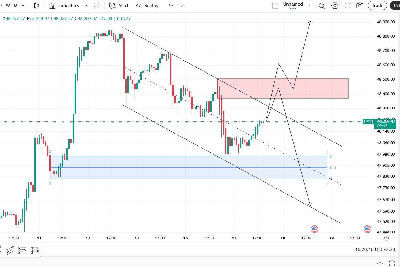 داوجونز در تایم فریم یک ساعته در سایکل کانال در حال حرکت است ناحیه قرمز رنگ محل تصمیم گیری ما میباشد ..صبور باشید تا به ناحیه مشخص شده برسد